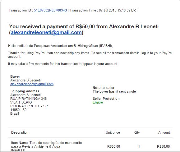 Authors maintain the copyrights for their work. However, they grant rights of first publication to Ambiente e Agua - An Interdisciplinary Journal of Applied Science. In compensation, the journal can transfer the copyrights, allowing non-commercial use of the article including the right of sending the article to other data bases or publication media. The journal uses the CC BY 4.0 license"