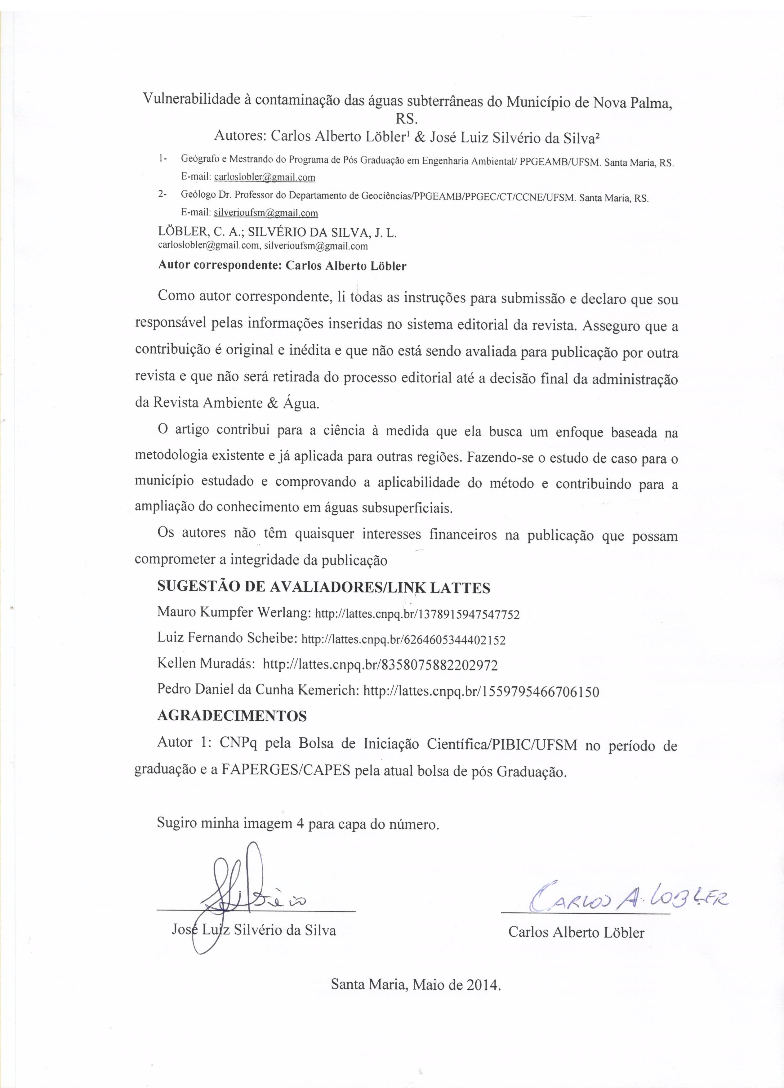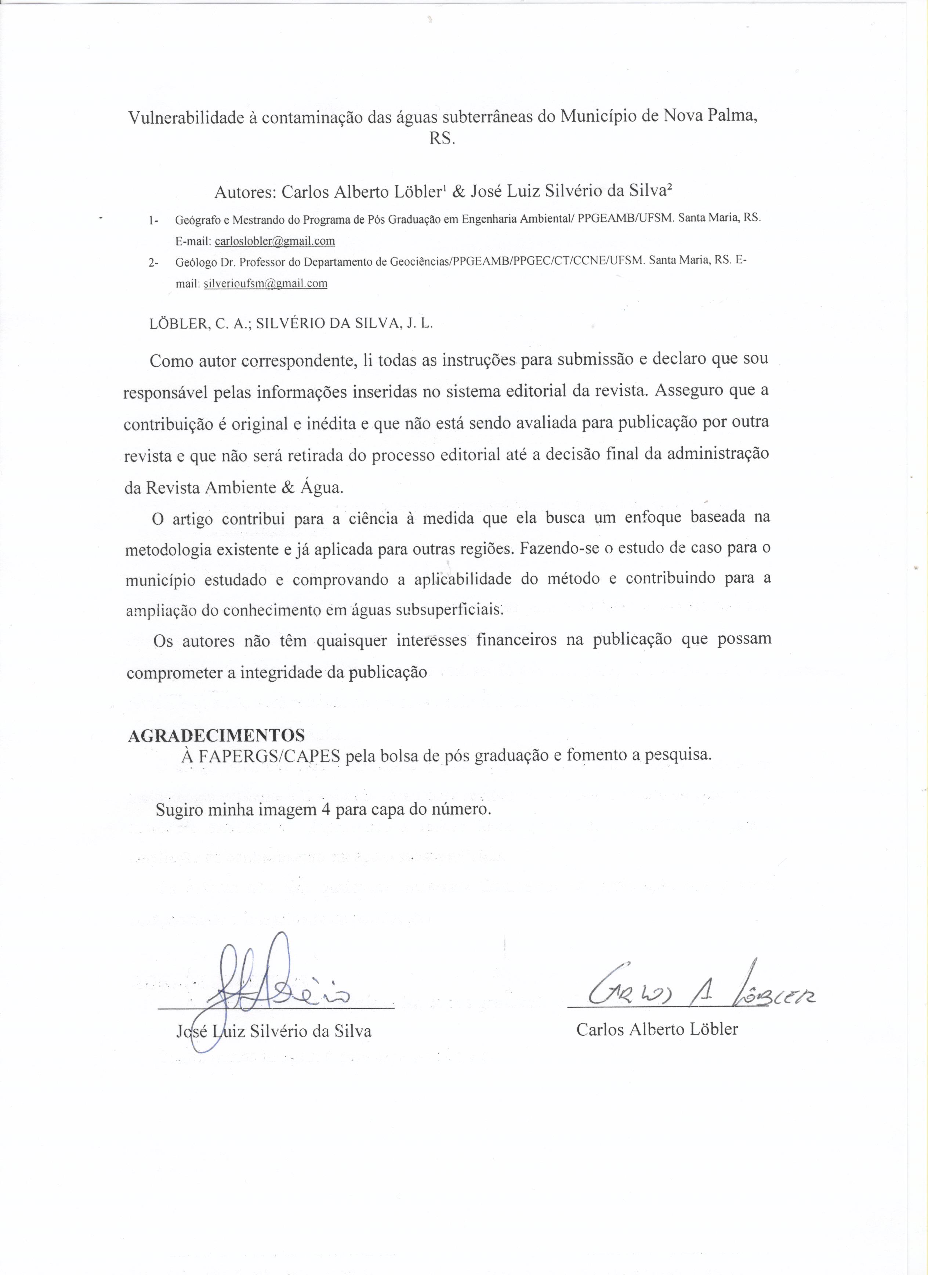 Authors maintain the copyrights for their work. However, they grant rights of first publication to Ambiente e Agua - An Interdisciplinary Journal of Applied Science. In compensation, the journal can transfer the copyrights, allowing non-commercial use of the article including the right of sending the article to other data bases or publication media. The journal uses the CC BY 4.0 license"