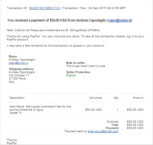 Authors maintain the copyrights for their work. However, they grant rights of first publication to Ambiente e Agua - An Interdisciplinary Journal of Applied Science. In compensation, the journal can transfer the copyrights, allowing non-commercial use of the article including the right of sending the article to other data bases or publication media. The journal uses the CC BY 4.0 license"